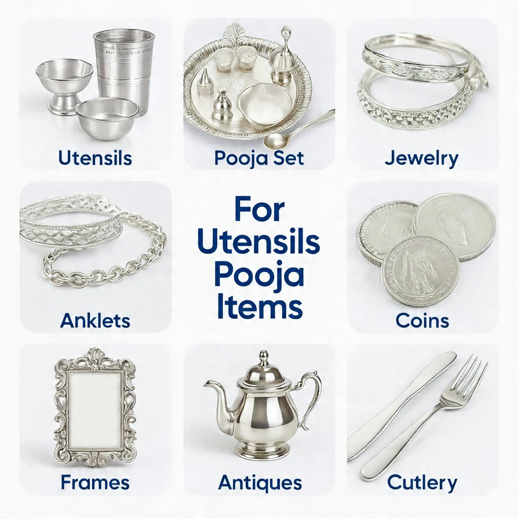 Effectively removes tarnish from silver utensils, jewellery, pooja items, coins, and decorative articles, restoring their natural shine within seconds.